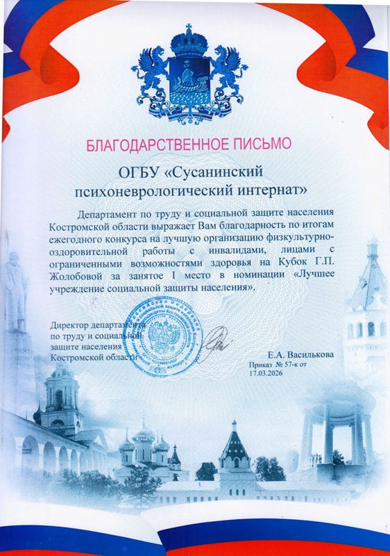 76 ОГБУ "Сусанинский ПНИ" Коллектив 17.03.2026 Благодарственнное письмо Департамента по труду и социальной защите населения Костромской области по итогам конкурса за лучшую организацию физкультурно-оздоровительной работы на Кубок Г.П. Желобовой, за 1 место в номинации "Лучшее учреждение социальной защиты населения"