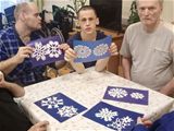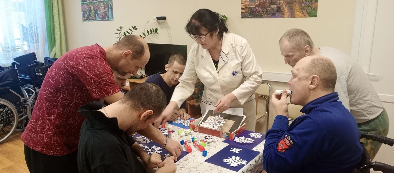 На этой неделе в отделении милосердия ОГБУ "Сусанинский ПНИ" состоялся интересный и полезный мастер-класс под названием "Снежинки". Социальные клиенты интерната приняли активное участие в творческом процессе.