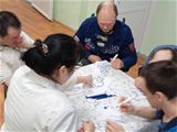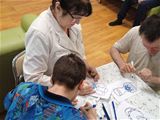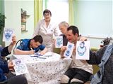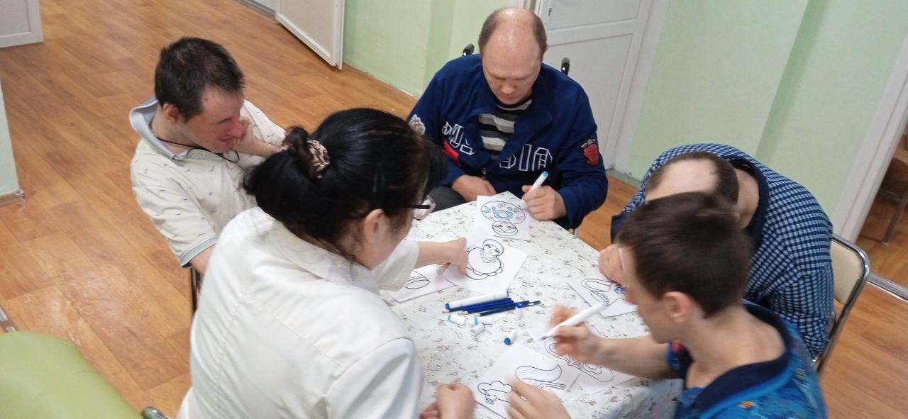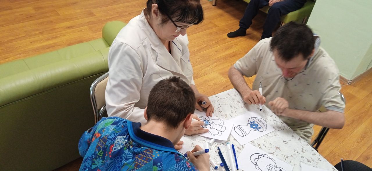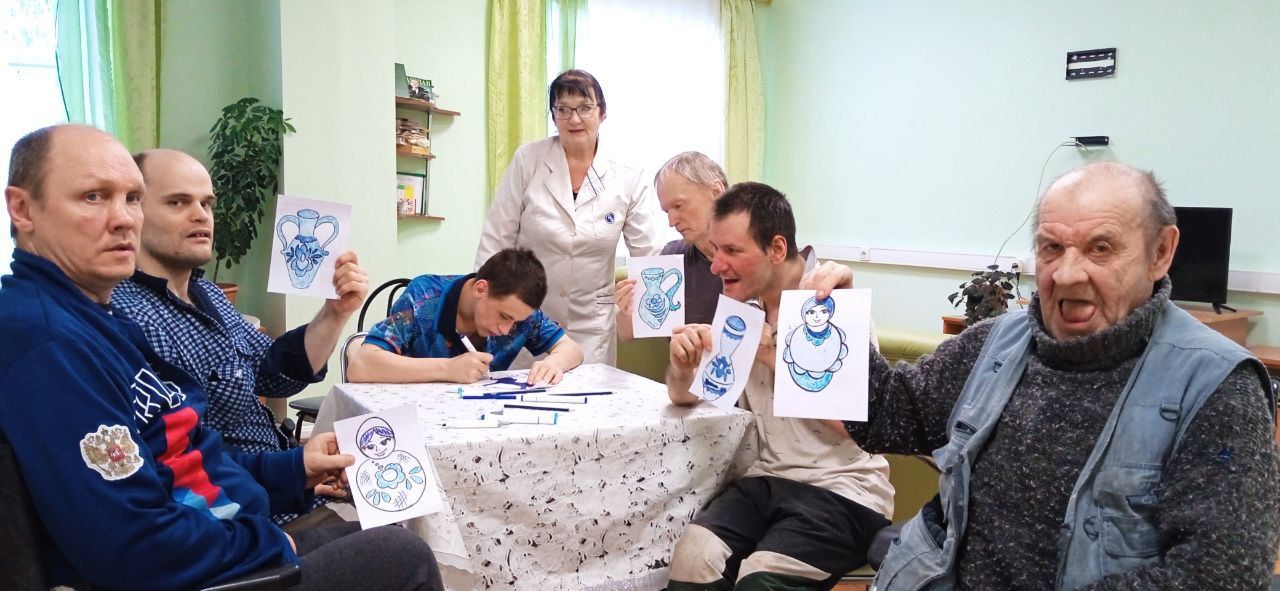 После теоретической части мастер-класс перешел в практическую плоскость. На заранее подготовленных рисунках социальные клиенты раскрашивали узоры синими и голубыми карандашами, стараясь передать неповторимый колорит этой техники.