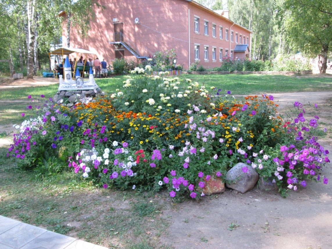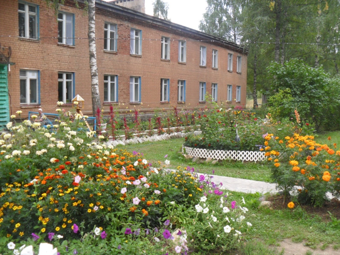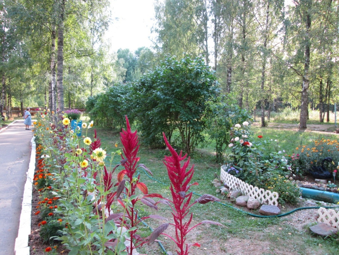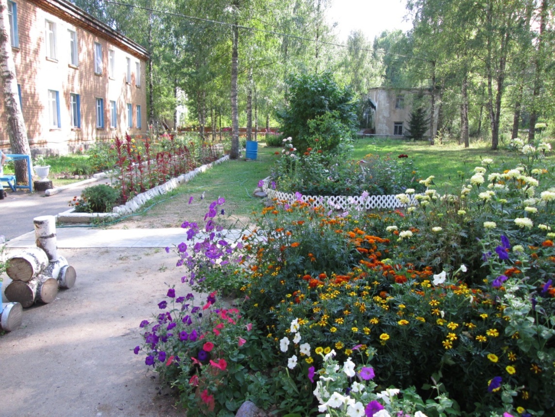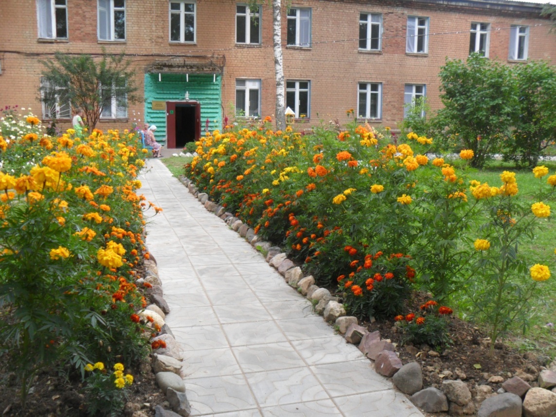 Самой главной частью  в благоустройстве территории корпуса являются яркие цветники, созданные руками инструктора по труду и клиентами отделения. Женщины ( клиенты отделения) всегда с большим интересом выращивают своими руками рассаду из семян , в дальнейшем ухаживают за растениями. С весны и всё лето наши цветники радуют глаз различными цветами: лесными ландышами, тюльпанами, нарциссами, ирисами, флоксами, георгинами, петуньями, бархатцами и многими другими цветами.