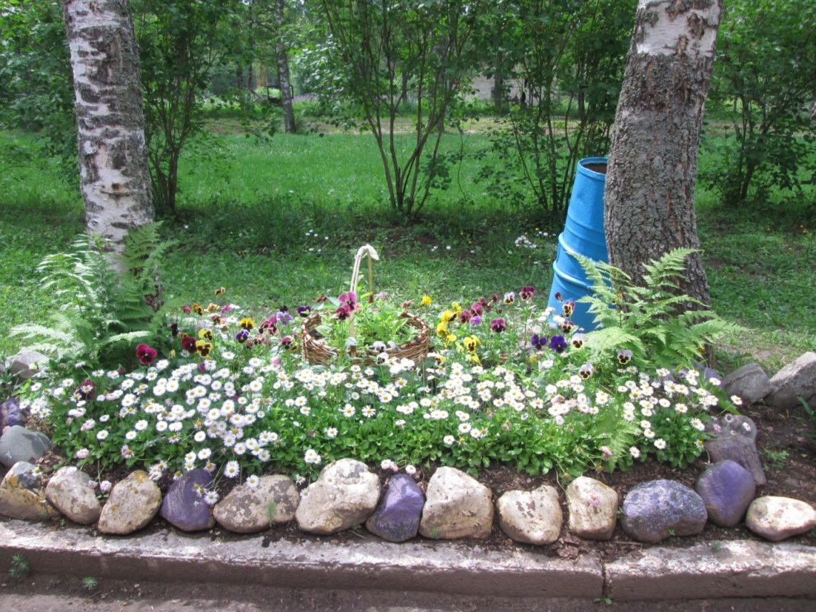 Интересная и необычная клумба с разноцветными виолками и розовыми маргаритками прекрасно вписывается в дизайн территории.