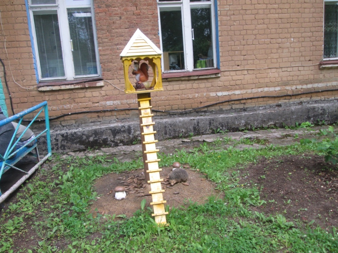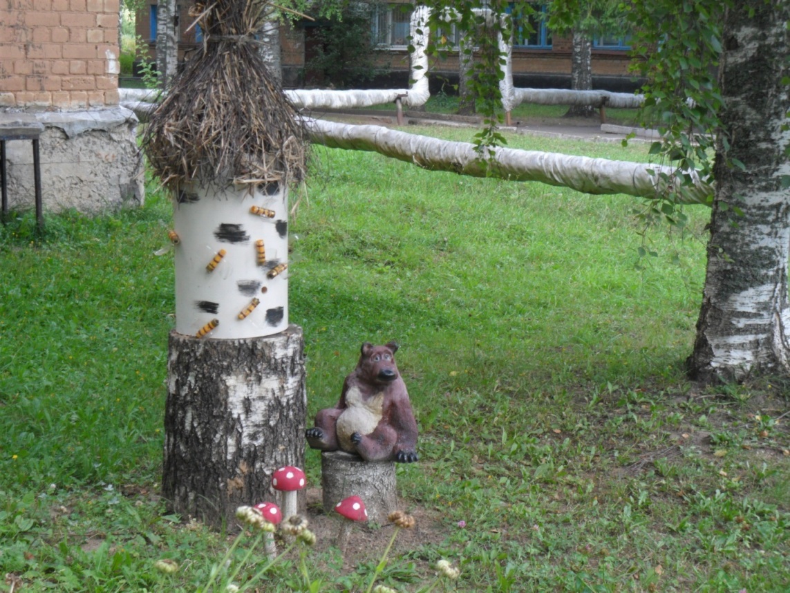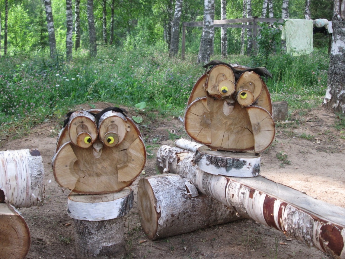 Забавные совы , сделанные из спилов дерева радуют глаз окружающих.   Так же не далеко от беседки, по правую сторону расположился искусственный водоём.