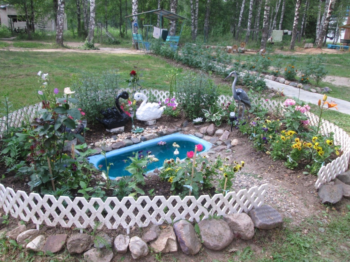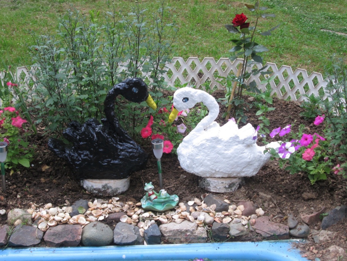 Белый и чёрный лебеди   сделанные своими руками отлично смотрятся на фоне голубоватой воды.   Наш водоём можно назвать “райским островком”.