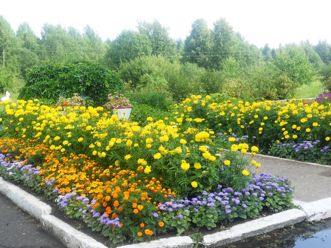 Мы старались подбирать цветы так, чтобы клумбы были постоянно цветущими в течение всего летнего сезона и радовали нас своими яркими красками.