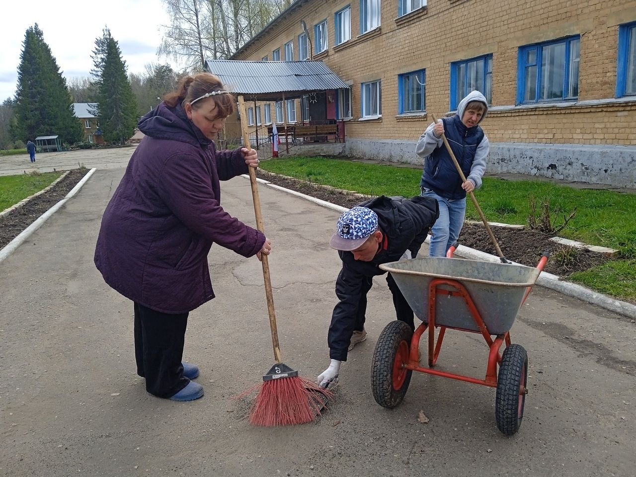 Следом за торжественной частью социальные клиенты интерната, вдохновленные веселыми песнями, посвященными празднику, дружно отправились на субботник. На территории ОГБУ "Сусанинский ПНИ" царила атмосфера единения и радости. Все участники с энтузиазмом взялись за работу, прибирая территорию и украшая ее к весеннему празднику.