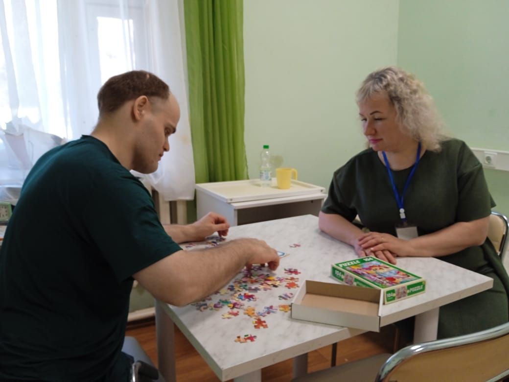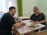 Одним из таких светлых событий стало проведение увлекательного вечера настольных игр в отделении милосердия. Инструктор по труду Разгуляева Елена Валентиновна и внутренние волонтеры с душой сыграли с проживающими отделения в любимые многими игры: шашки, шахматы и лото. Атмосфера была тёплой и непринужденной. Участники сосредоточенно делали ходы, азартно сражаясь за победу, но главное – наслаждались общением и поддержкой друг друга.