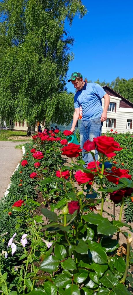 Ежегодный цикл работ включает в себя обрезку кустов, удаление сорняков, внесение удобрений и обработку от вредителей и болезней. Такой комплексный подход позволяет сохранить здоровье и декоративность роз, создавая поистине живописную картину. Уход за розарием не только украшает территорию учреждения, но и способствует развитию практических навыков наших социальных клиентов, прививает им чувство ответственности и любовь к природе.