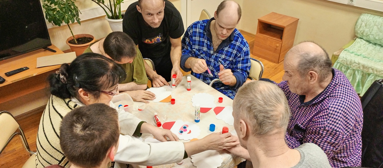 Социальные клиенты отделения с большим энтузиазмом принялись за работу. Под чутким руководством Ирины Анатольевны они аккуратно склеивали детали фигуры сказочного дедушки: пухлую бороду, красную шапку с белым мехом.