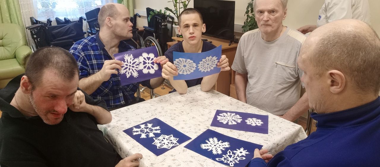 На этой неделе в отделении милосердия ОГБУ "Сусанинский ПНИ" состоялся интересный и полезный мастер-класс под названием "Снежинки". Социальные клиенты интерната приняли активное участие в творческом процессе.