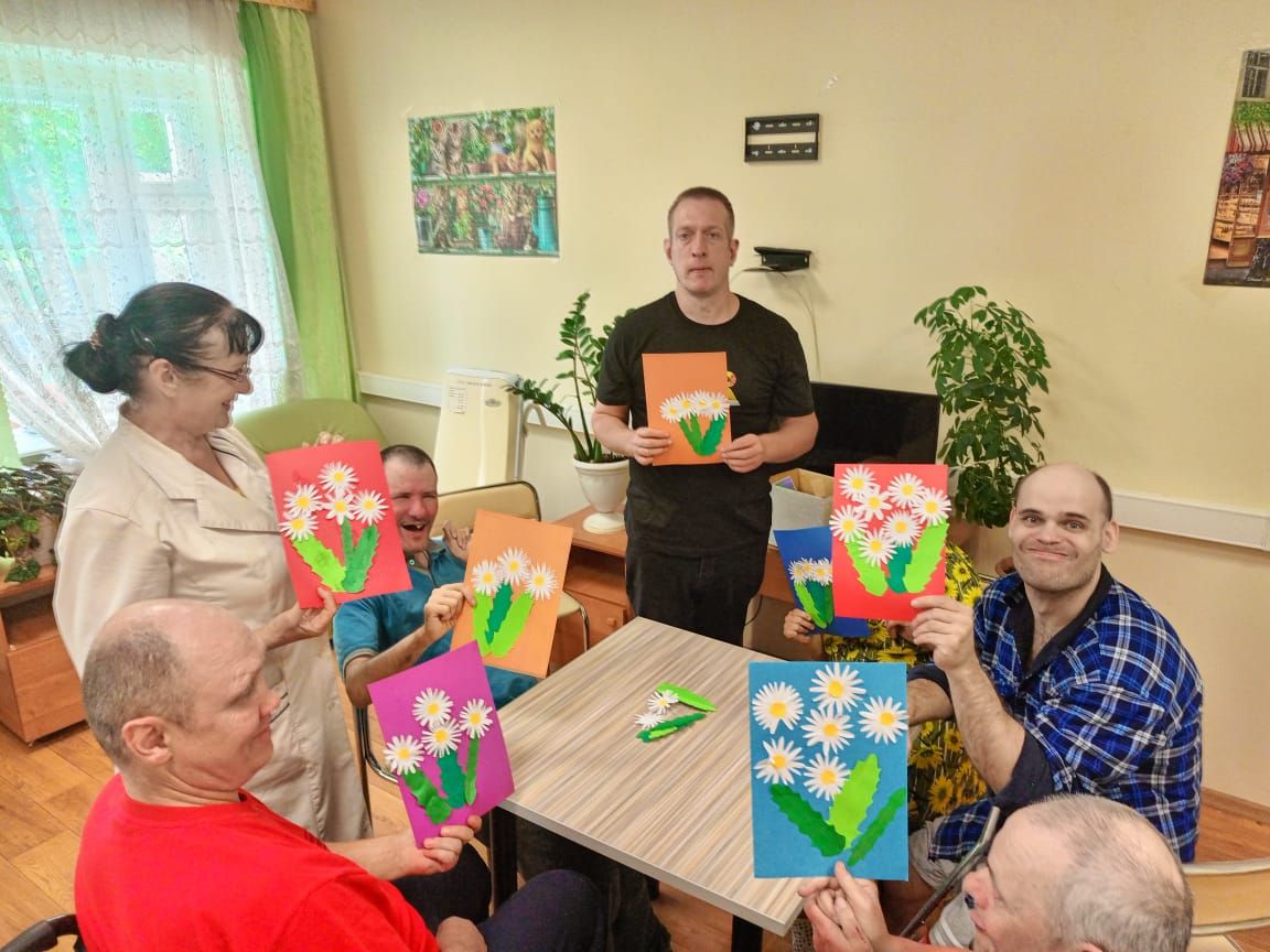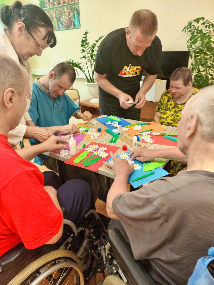 День ромашек, отмечаемый в России 24 июня, был особо теплым и радостным событием для социальных клиентов отделения милосердия ОГБУ «Сусанинский ПНИ». Инструктор по труду Нарскина Ирина Анатольевна провела увлекательный мастер-класс по аппликации из бумаги под названием "Букет радости".