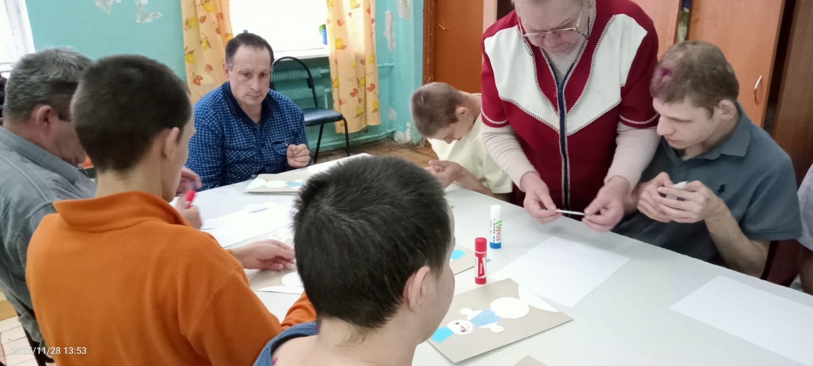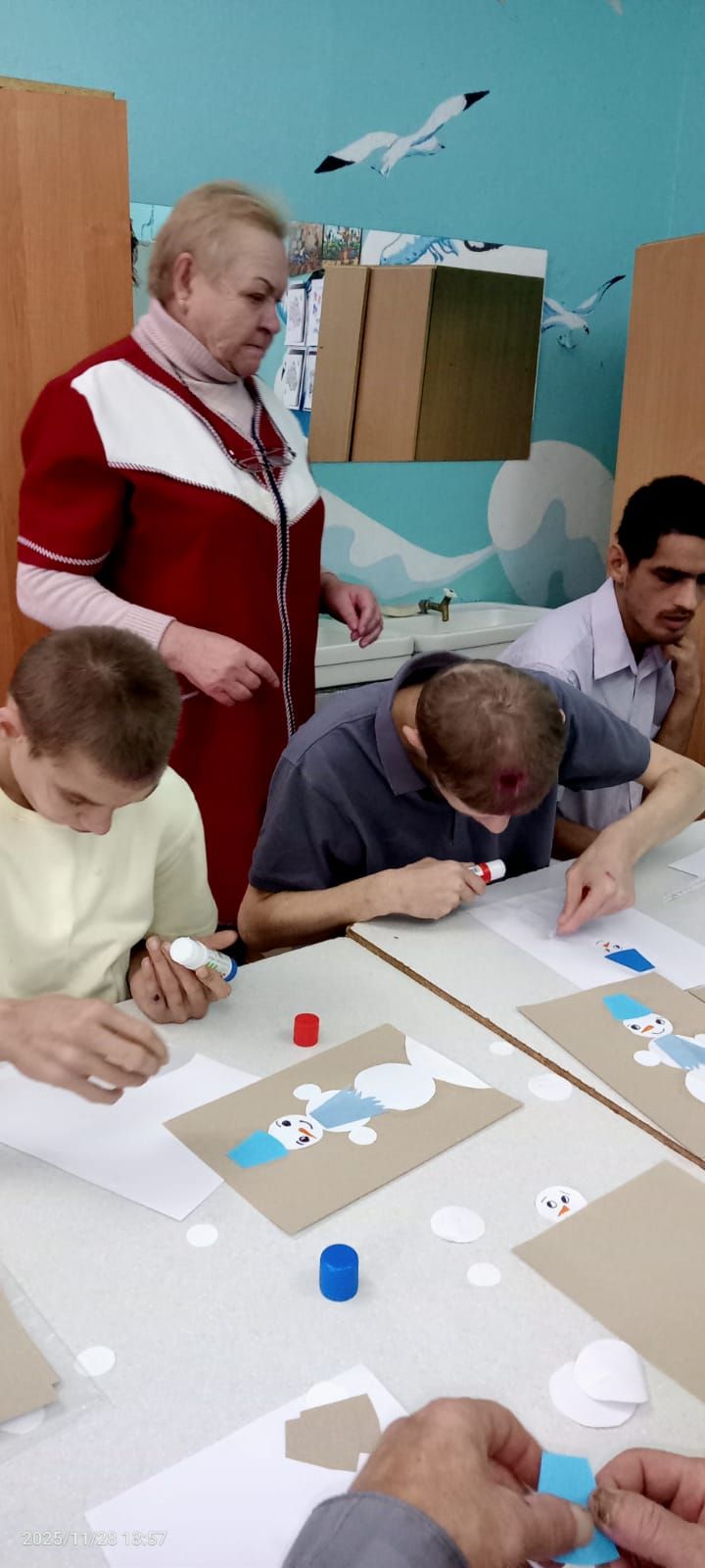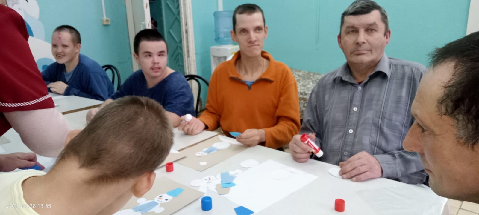Сегодня в отделении милосердия №1 ОГБУ "Сусанинский ПНИ» прошло интересное мероприятие, посвященное уходу осени и приходу зимы. Под руководством инструктора по труду Куракиной А.Е. социальные клиенты с большим энтузиазмом занимались созданием аппликаций в виде милых снеговиков.