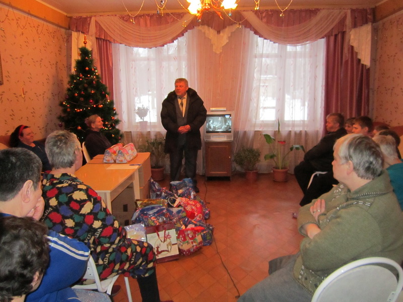 Исполняющий обязанности директора Иван Леонидович Цвирко лично поздравил работников и проживающих каждого отделения с наступающим праздником и вручил новогодние подарки. Красочные подарочные пакеты для всех проживающих были предоставлены Благотворительным Фондом помощи инвалидам и пожилым, живущим в домах престарелых, «Старость в радость».