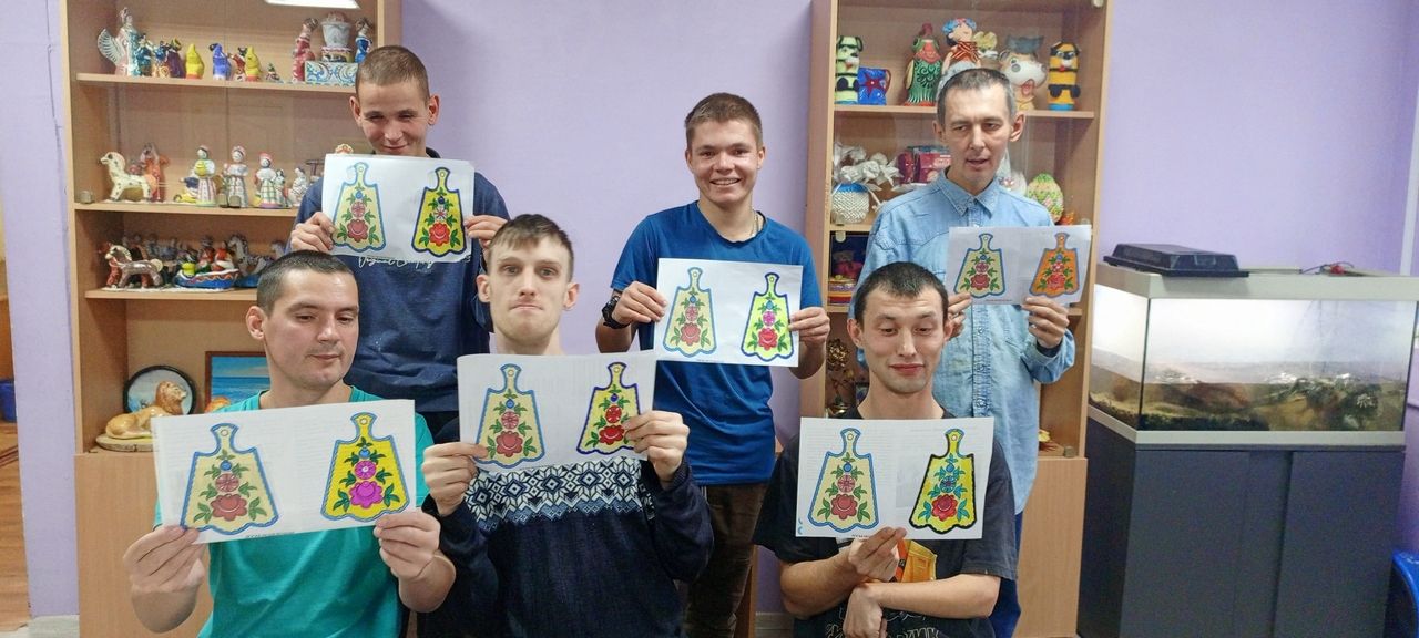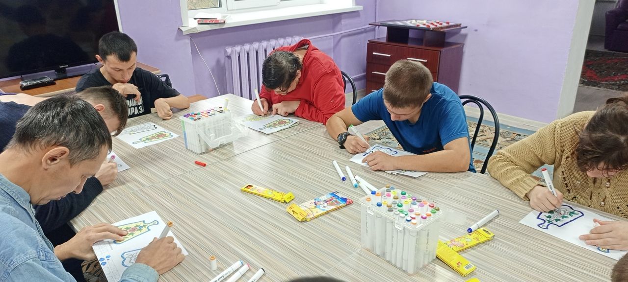 Социальным клиентам были предоставлены раскраски с изображением разделочных досок, украшенных традиционными мотивами городецкой росписи. На правой стороне листа располагался образец, а на левой – аналогичный рисунок, который клиенты должны были раскрасить по образцу.