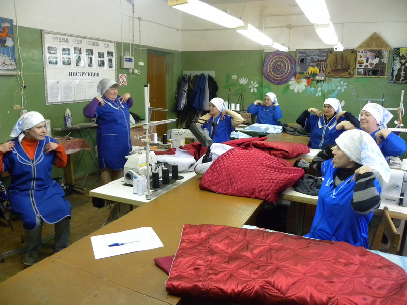 Работа в швейном цехе требует усидчивости, напряжения, внимания. Поэтому каждый час проводится производственная гимнастика. Для проживающих разработано несколько комплексов такой гимнастики продолжительностью 7-10 минут.