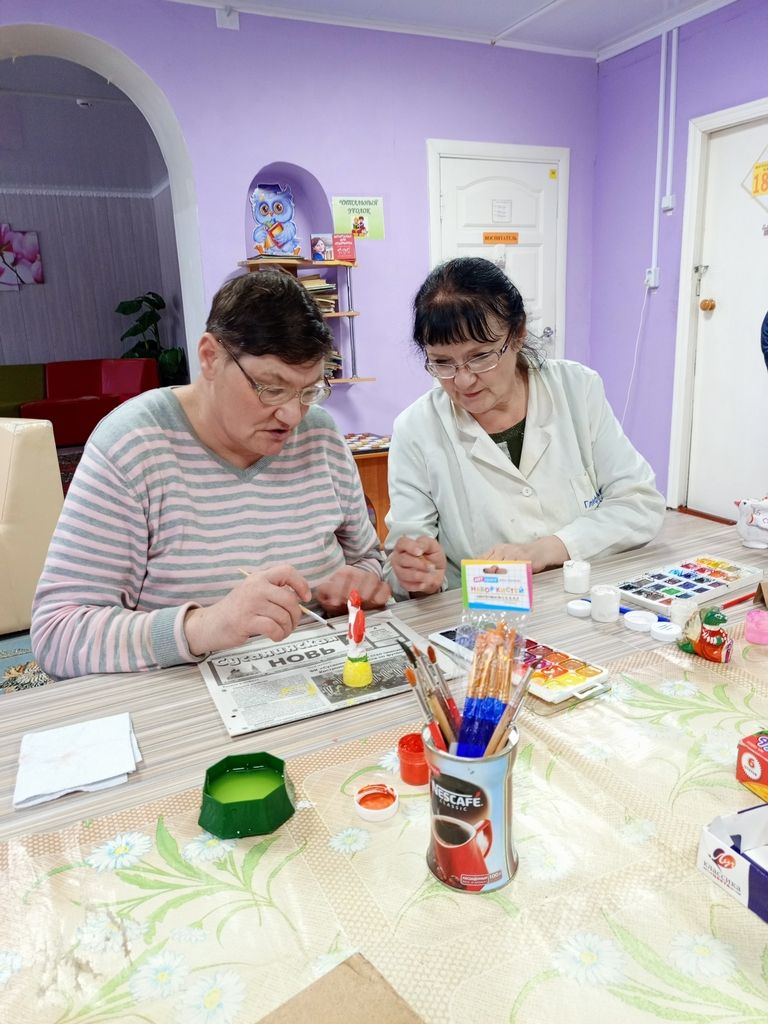 Сегодня в ОГБУ "Сусанинский ПНИ" на занятии кружка "Лепка из глины", которым руководит Нарскина Ирина Анатольевна, воспитанники отделения реабилитации украшали свои глиняные изделия. Эти поделки были изготовлены ими же ранее на том же кружке.